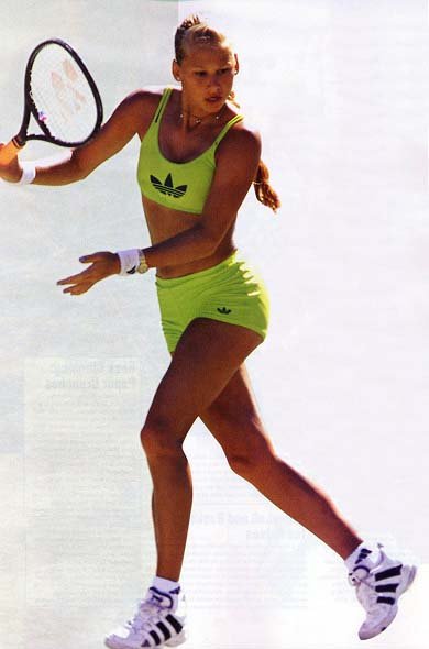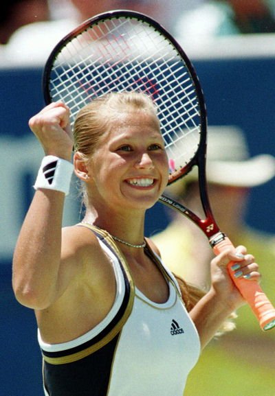 Dieu soit loué ! s'il manquait bien une chose dans le monde du tennis ( si ce n'était qu'une chose ... enfin je dois vous avouer que depuis je m'y intéresse plus... ); c'est bien quelque chose d'intéressant. Et bien avec Anna, c'est chose faite, fini les torticolis à regarder le seul trucs qui bouger de gauche à droite puis de droite à gauche puis de... Désormais, vous resterez scotché du même coté durant chaque set avec la belle Anna Kournikova. Il est vrai que son jeune âge associé à un corps de rêve ont provoqué quelques émois dans le monde du tennis lorsqu'ils ont appris qu'elle s'amusait à poser pour la mode et faire des pubs à bras le corps. Moi je dis: pure jalousie, enfin y'a de quoi, Mauresmo avec sa vielle gueule de gars, et Hingis avec ses boutons d'acmé à 21 ans; mois je dis bravo Anna !